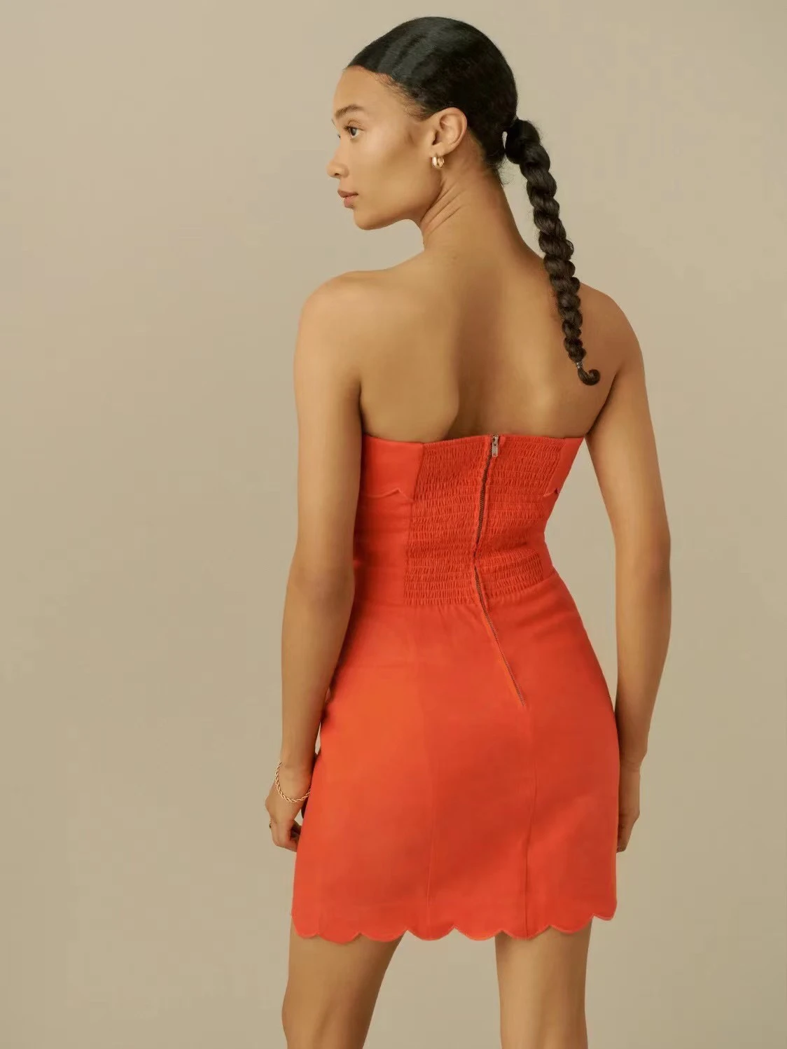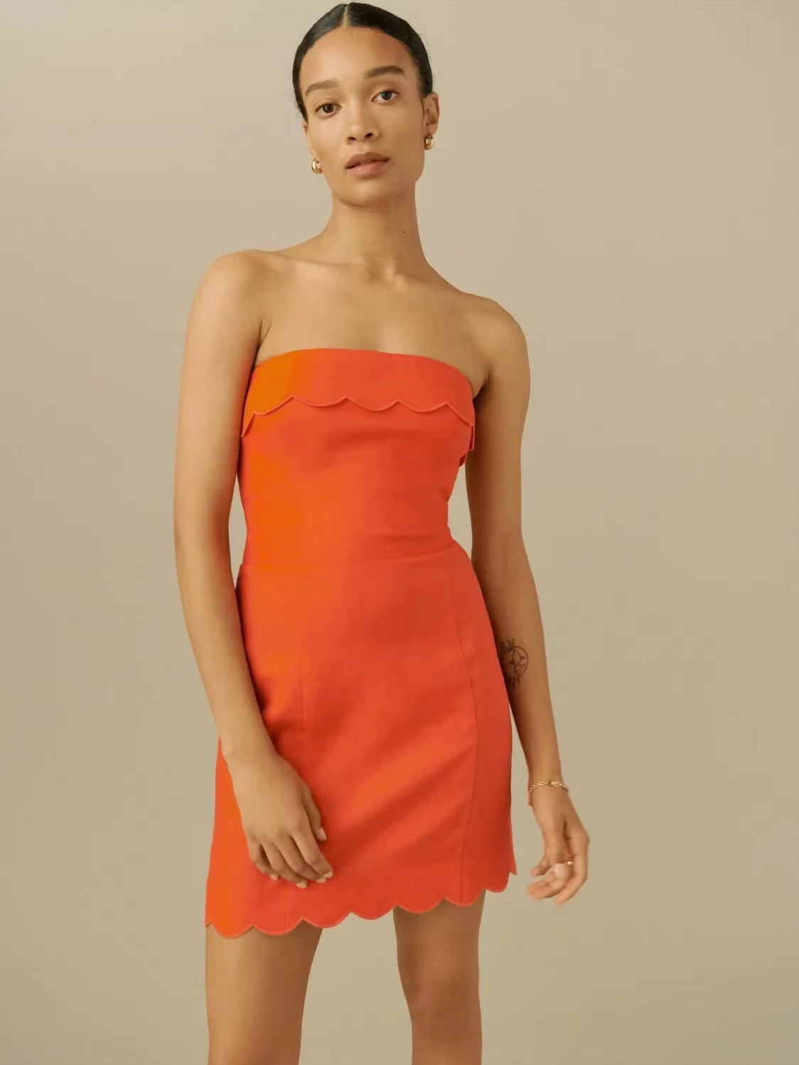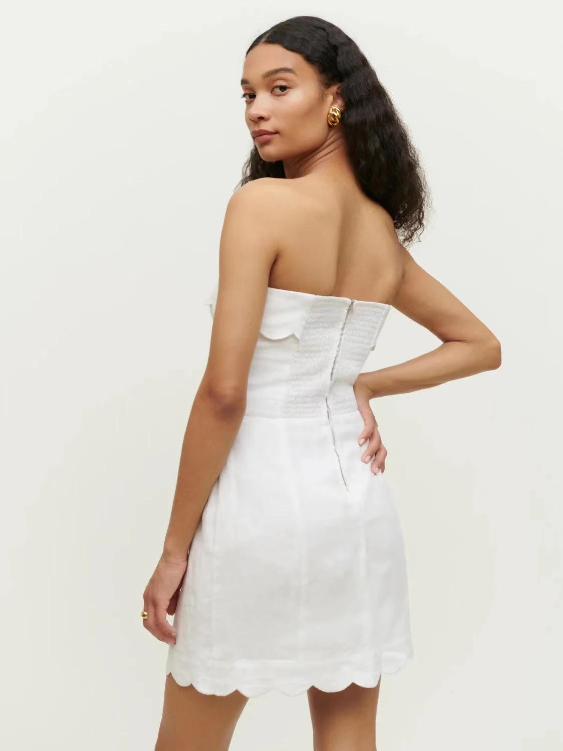 Женское облегающее льняное мини-платье без бретелек с волнистым вырезом