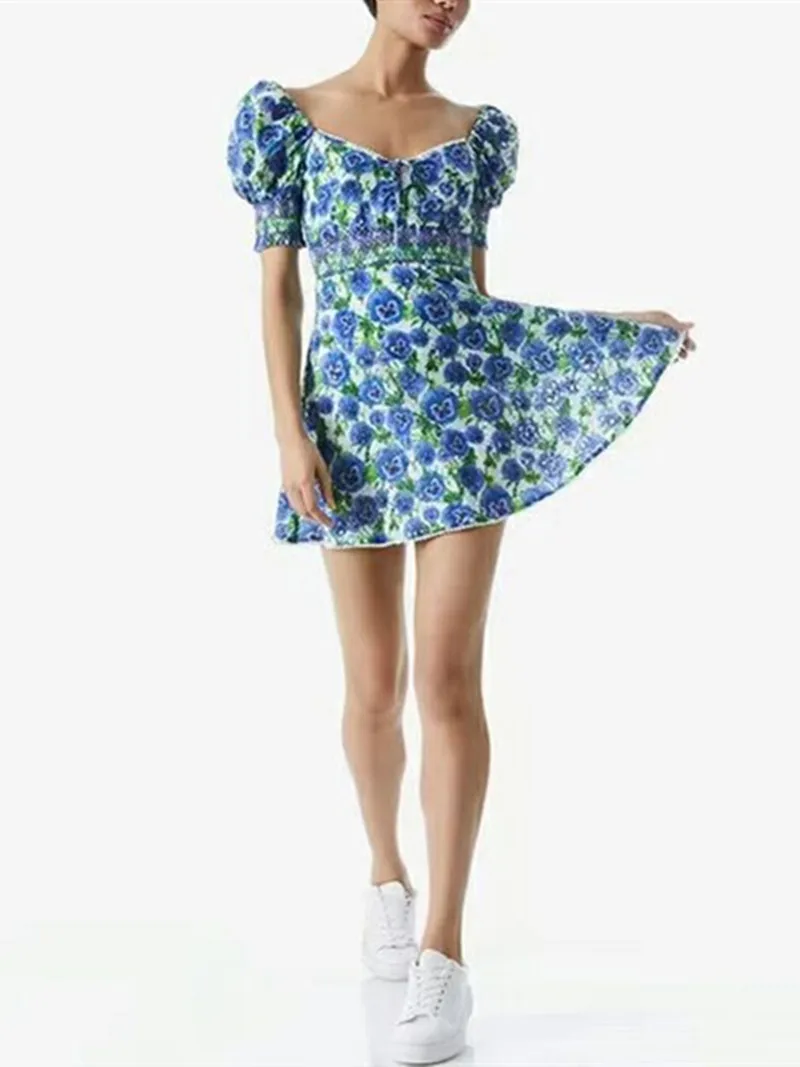 Женское облегающее мини-платье с бисером, короткое платье на молнии с принтом синих роз и квадратным вырезом, лето 2022