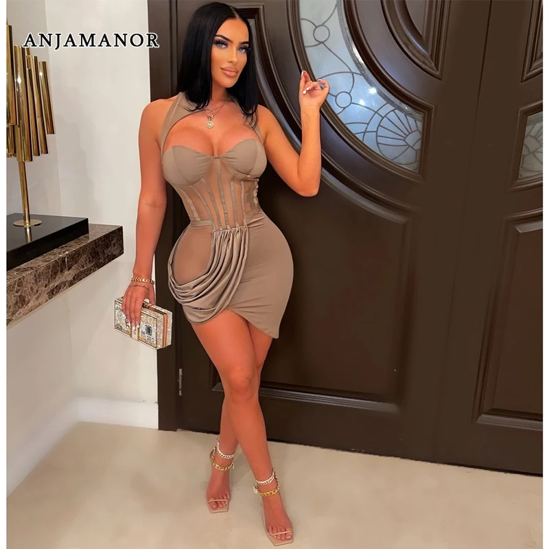 Женское облегающее мини-платье с сеткой и лямкой на шее