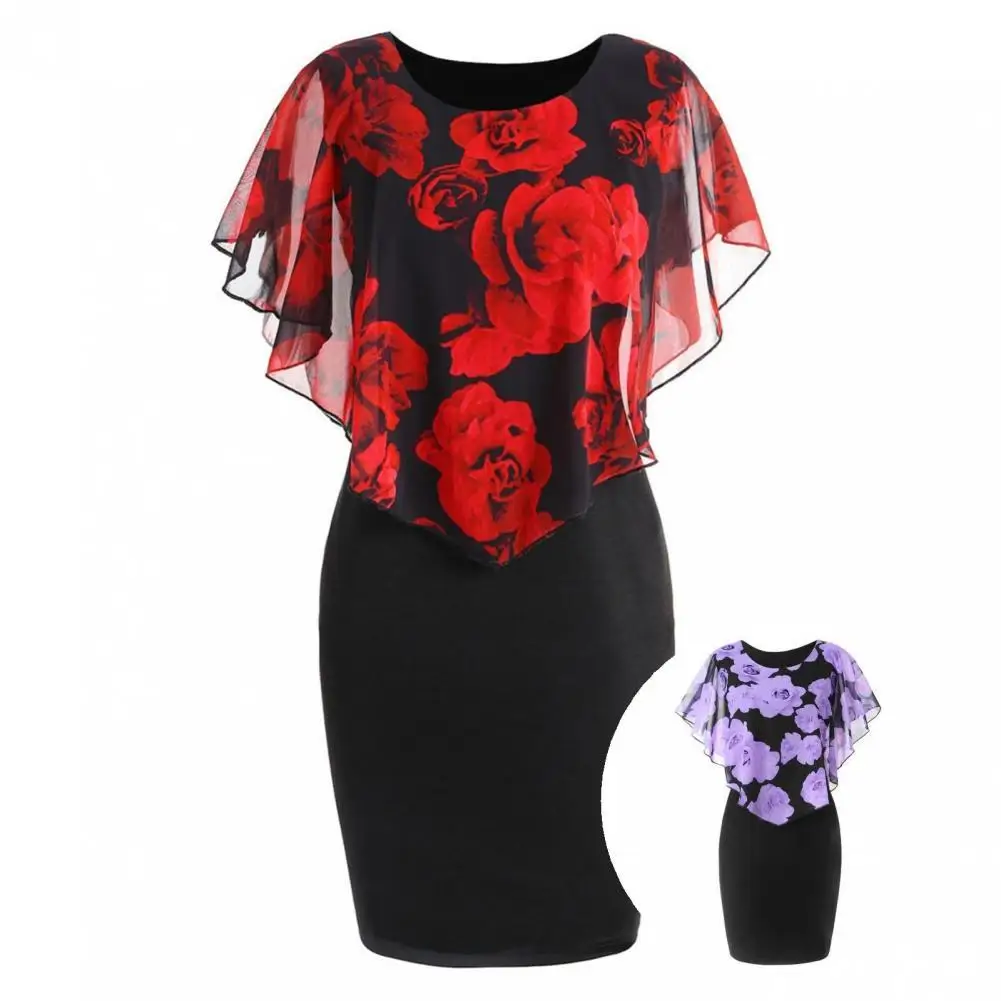 Женское облегающее платье до колен с цветочным принтом и круглым вырезом