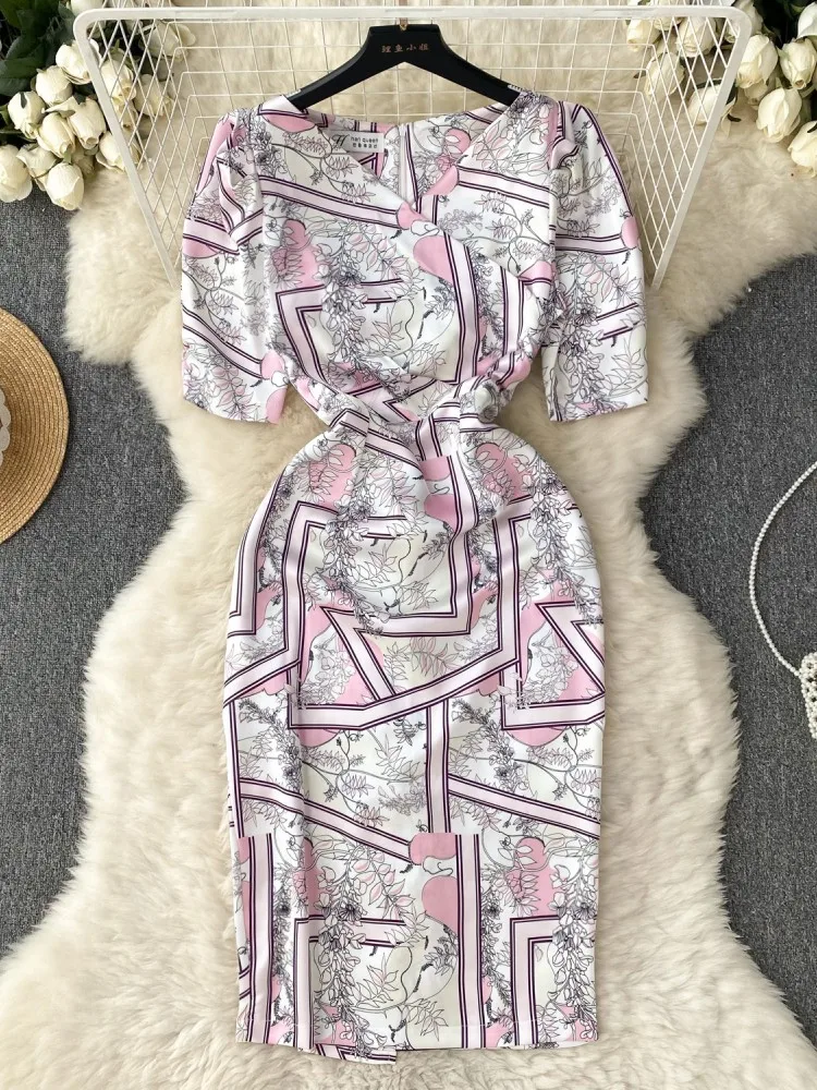 Женское облегающее платье-карандаш с коротким рукавом, V-образным вырезом и цветочным принтом