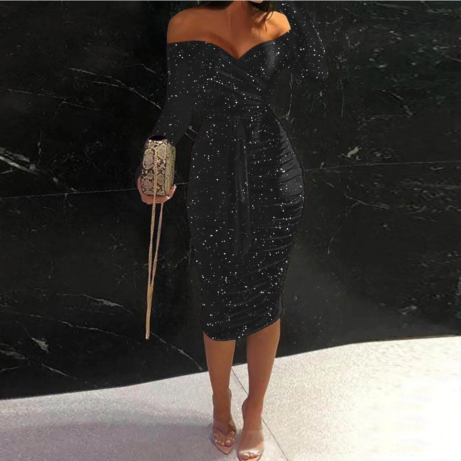 Женское облегающее платье миди с открытыми плечами, длинным рукавом и оборками