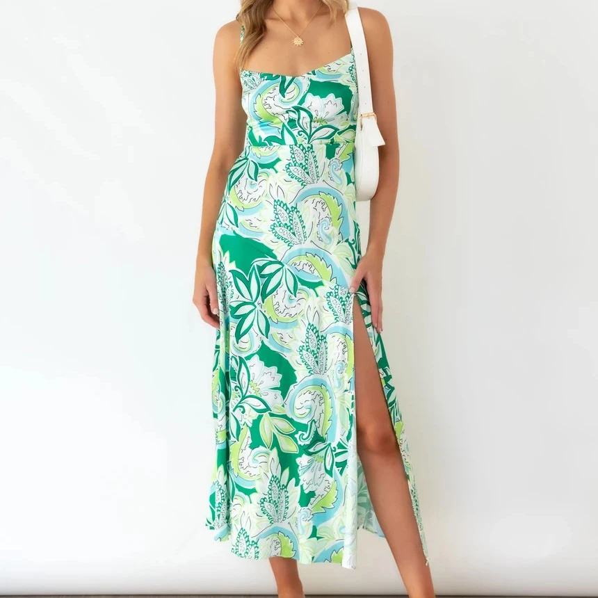 Женское облегающее платье на бретелях-спагетти, элегантное зеленое платье с длинным разрезом и принтом, вечерние нее Клубное платье, лето ...