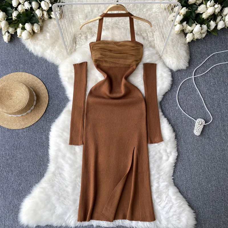 Женское облегающее платье-свитер с открытой спиной и лямкой на шее