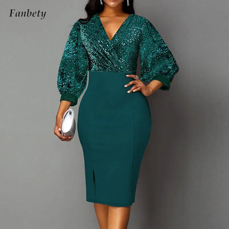 Женское облегающее платье с блестками, длинным рукавом и V-образным вырезом