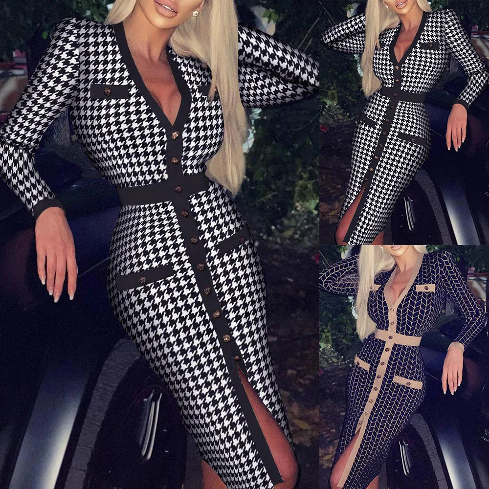 Женское облегающее платье с геометрическим принтом, черно-белое платье с V-образным вырезом и пуговицами