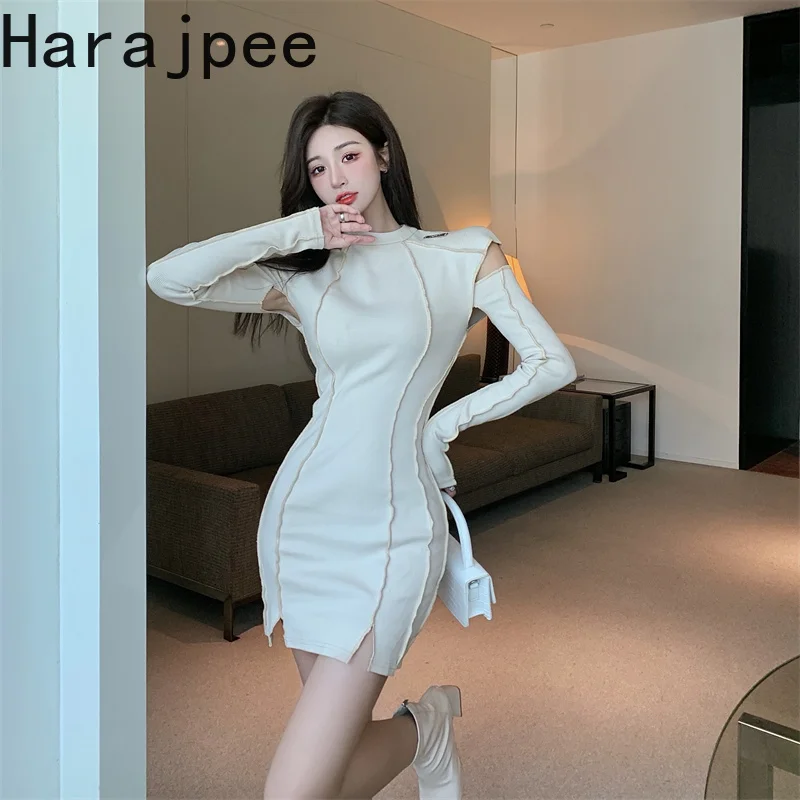 Женское облегающее платье с разрезом, длинным рукавом и воротником-стойкой
