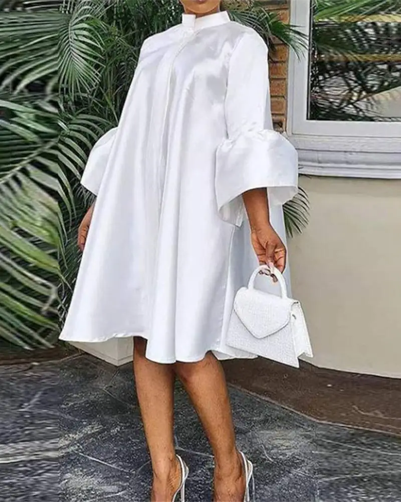 Женское однобортное платье-рубашка, Длинное свободное белое платье до колена с рукавами-колокольчиками и пуговицами, весна-лето