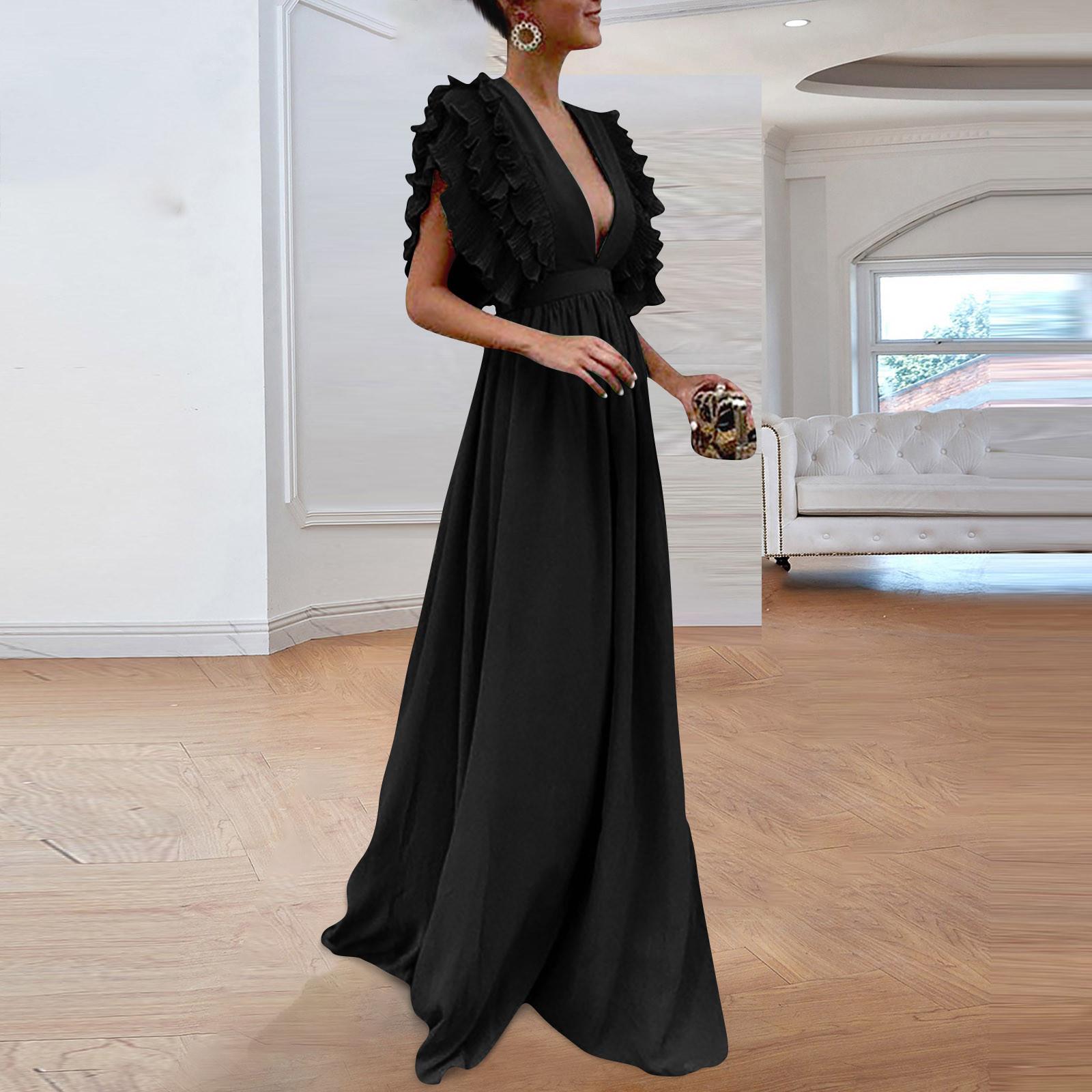 Женское однотонное винтажное длинное вечернее платье с v-образным вырезом и рукавами-крылышками больших размеров сзади L чёрный