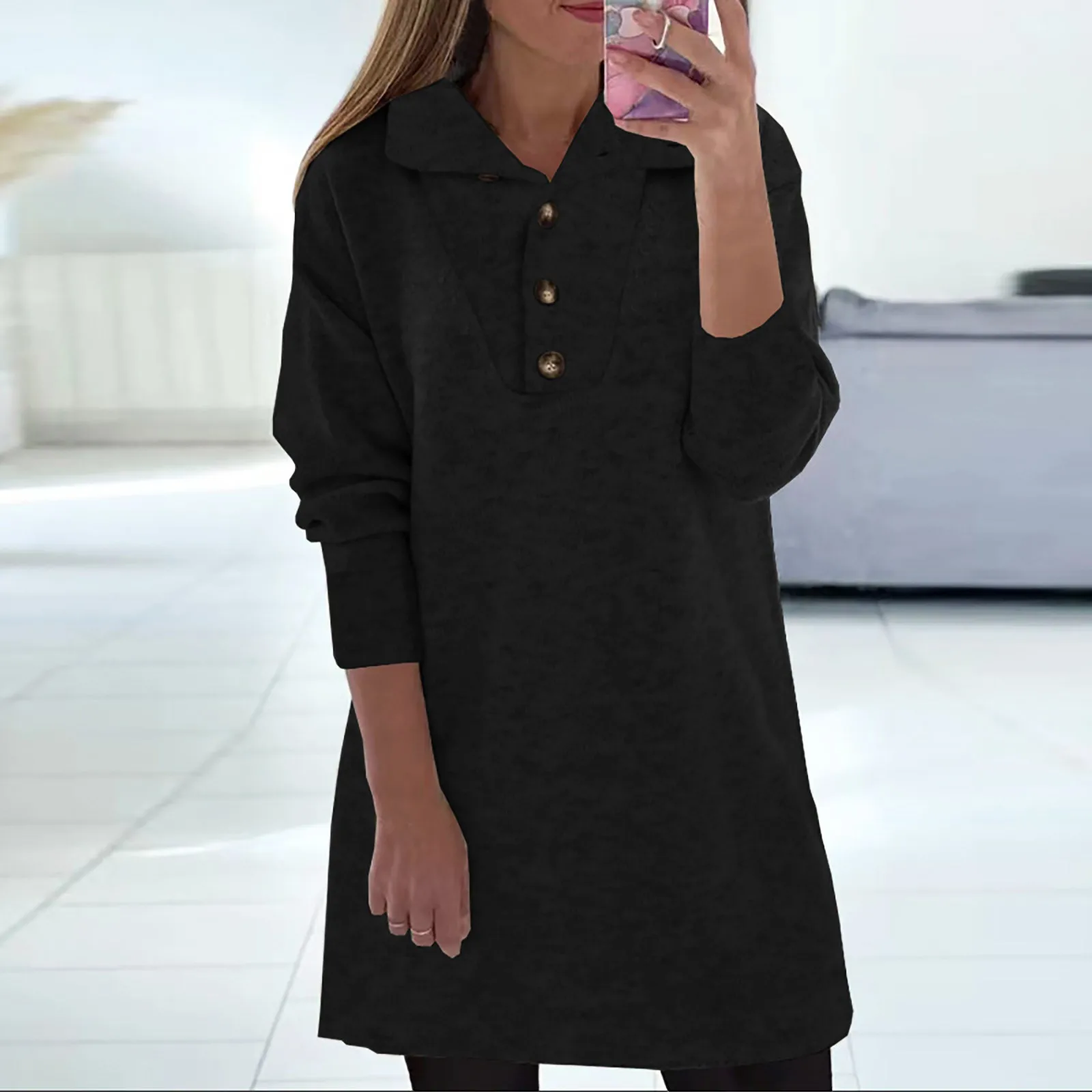 Женское однотонное платье-рубашка на пуговицах, с отворотом и длинным рукавом