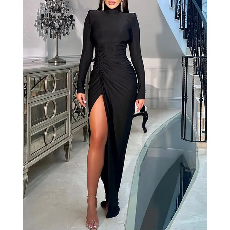 Женское однотонное платье с высоким воротником и разрезом на плечах
