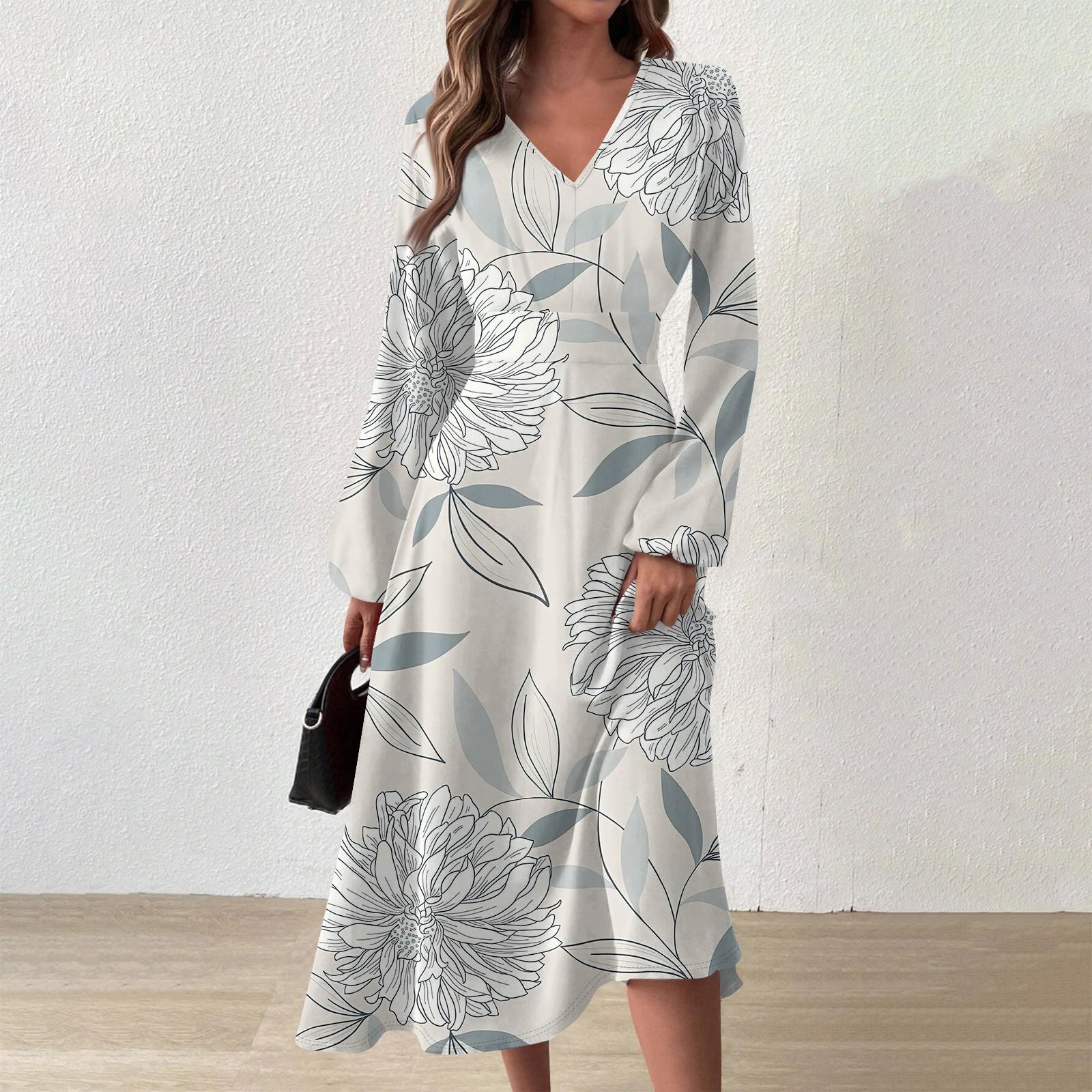 Женское осеннее и зимнее повседневное модное длинное платье с v-образным вырезом и длинным рукавом с цветочным принтом XL