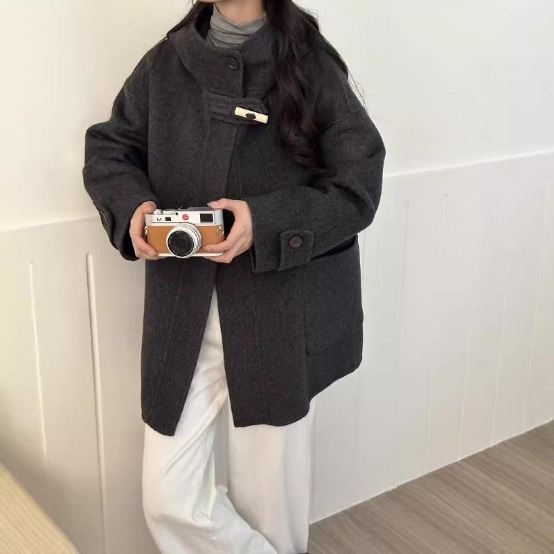 Женское осенне-зимнее новое короткое свободное двухстороннее шерстяное пальто с капюшоном S темно-серого
