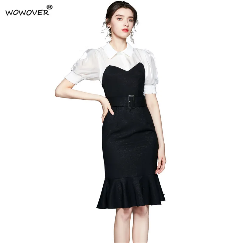 Женское офисное платье с юбкой годе, Элегантное Белое и черное однотонное платье с коротким рукавом и поясом для вечерние, 2021