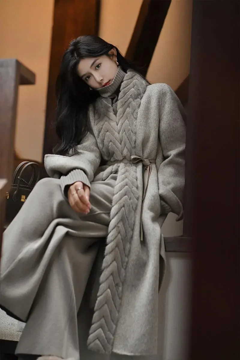Женское пальто, четкая и стильная зимняя одежда, кожаный меховой ремень