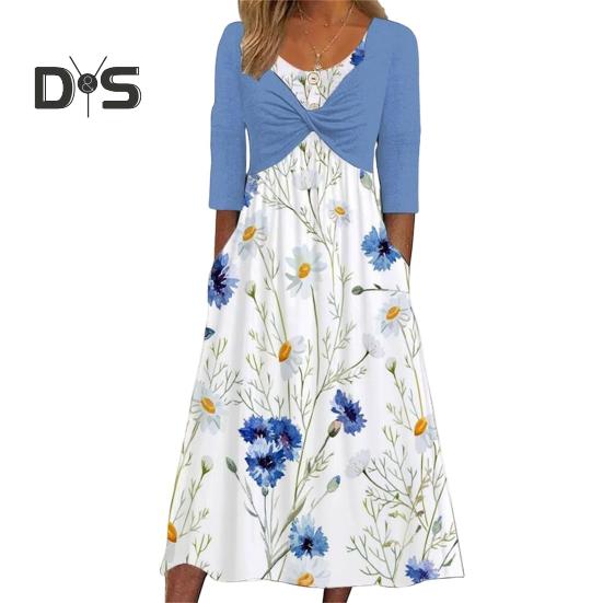 Женское платье Поддельное платье-пальто из двух частей Лоскутное платье с цветочным принтом Плиссированные боковые карманы Круглая шея До середины икры Длина с половиной рукавом Женское ежедневное платье для поездок на работу XL светло-синий