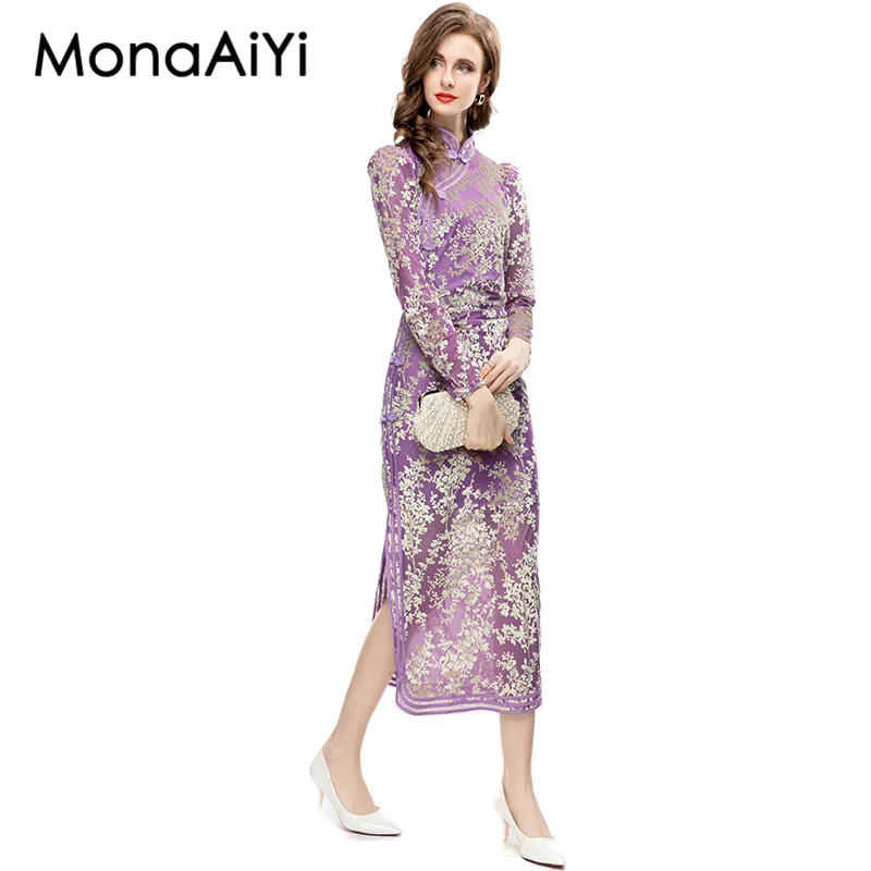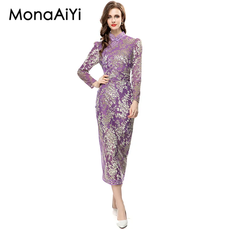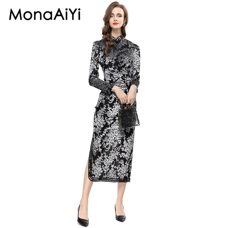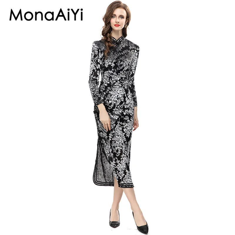 Женское платье-Ципао из полиэстера, с длинным рукавом и разрезом
