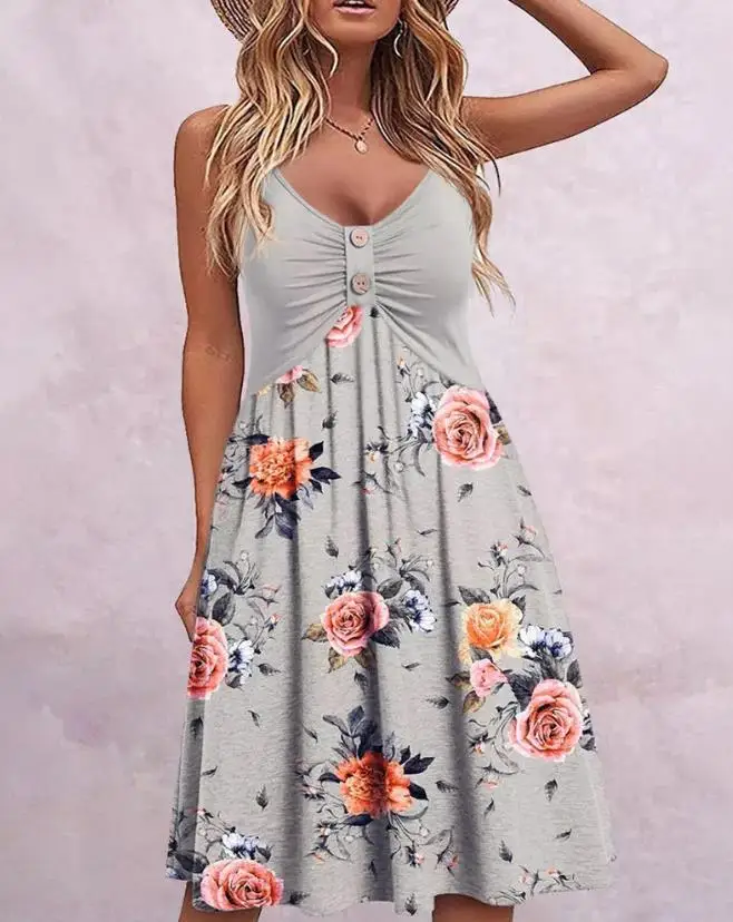 Женское платье без рукавов, повседневное ТРАПЕЦИЕВИДНОЕ ПЛАТЬЕ с цветочным принтом, V-образным вырезом и рюшами, Y2K, лето 2023