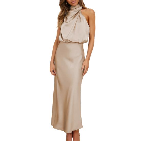 Женское платье без рукавов с лямкой на шее, платье с открытыми плечами и талией, облегающее бедро, свободное подол, гладкое атласное вечернее платье миди L абрикосовый