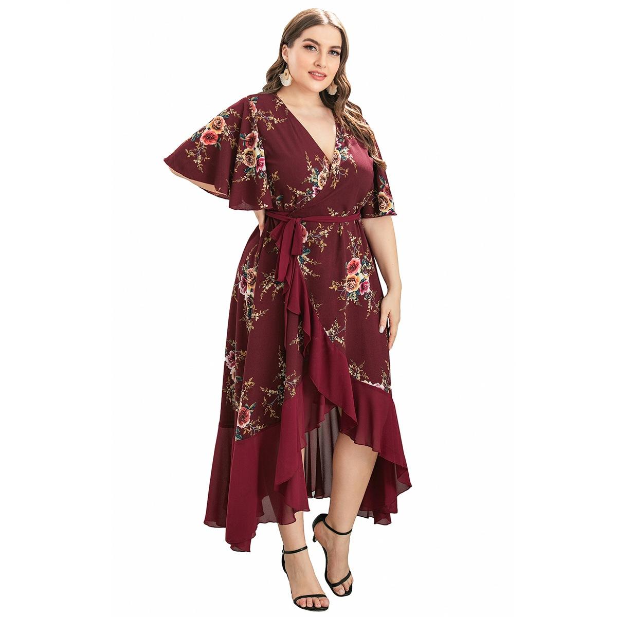 Женское платье больших размеров, летние платья с v-образным вырезом и рюшами, платья с нерегулярным принтом, длинные платья 3XL бордовый