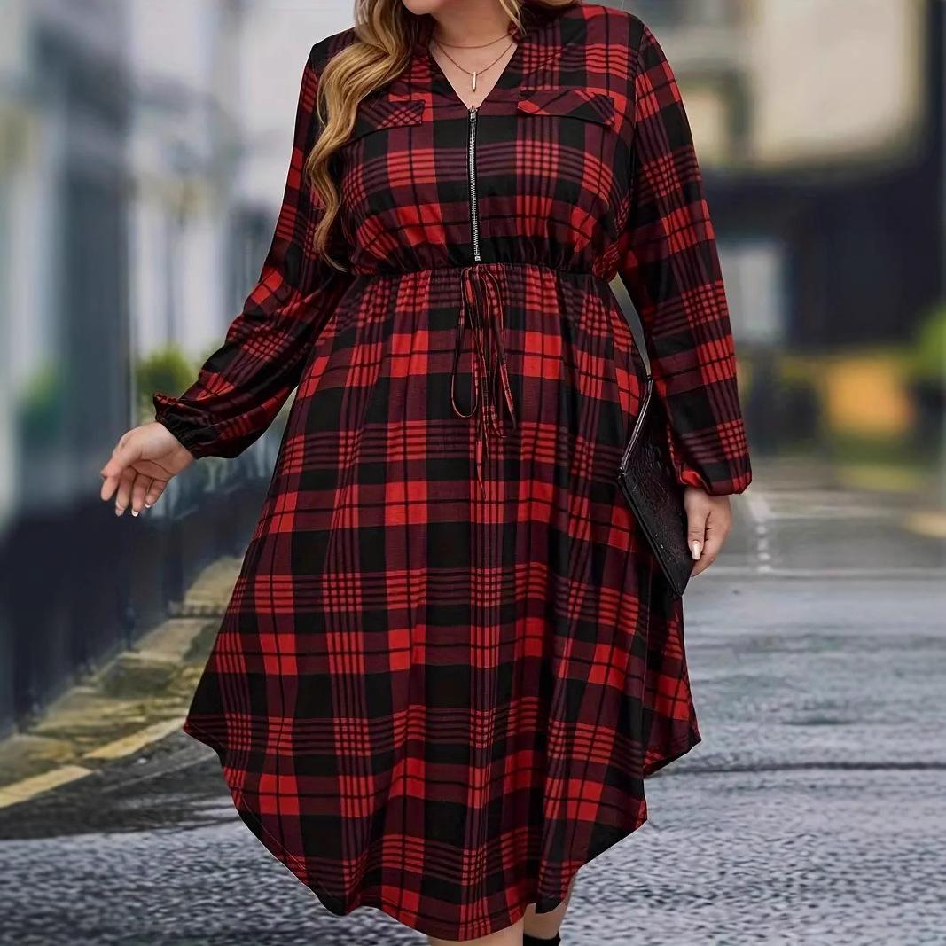 Женское платье больших размеров с клетчатым принтом, повседневное платье с длинным рукавом и V-образным вырезом на молнии 4XL