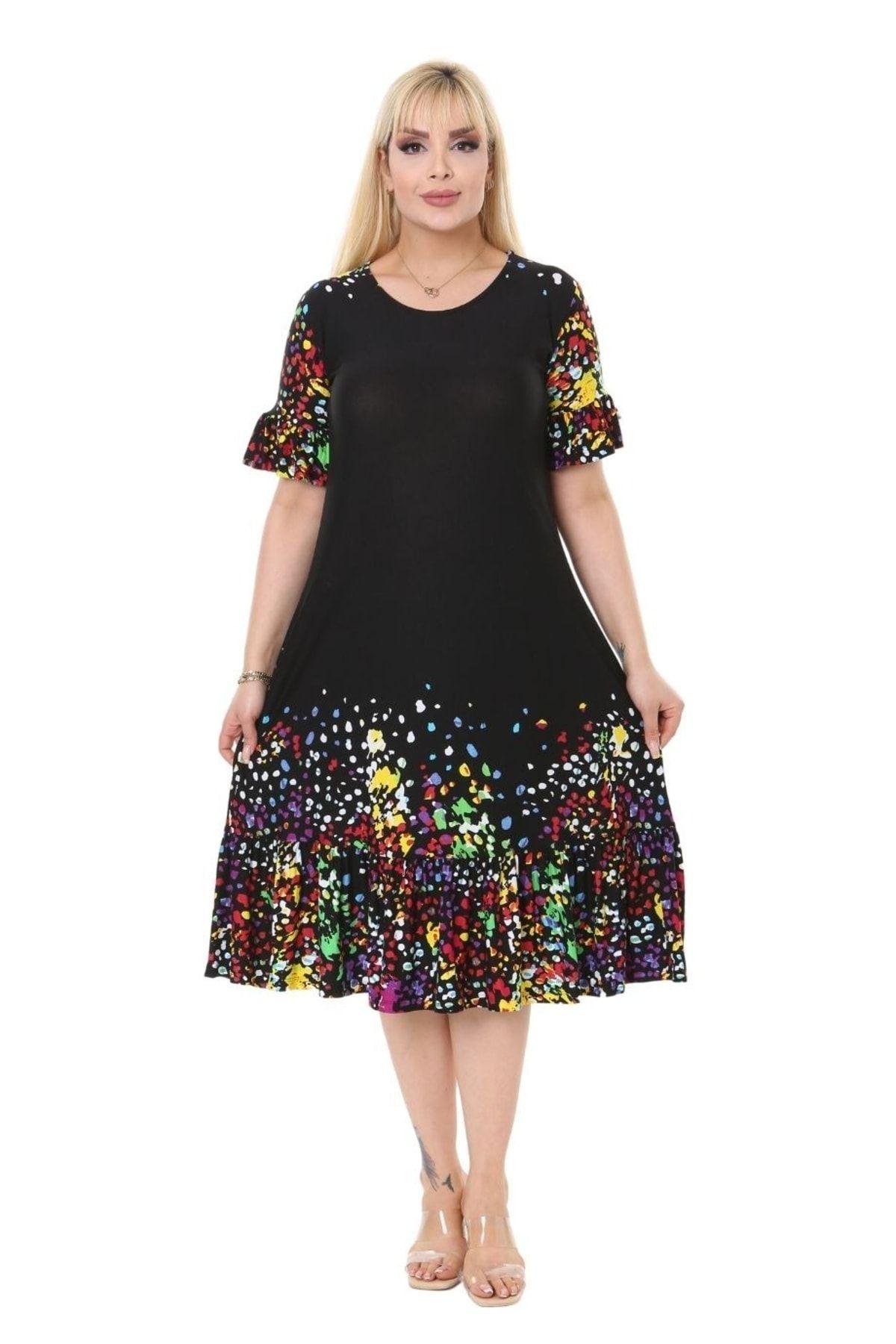 Женское платье большого размера. Платье больших размеров с карманами и акварельным узором, рукавами с оборками и юбкой. XL/2XL