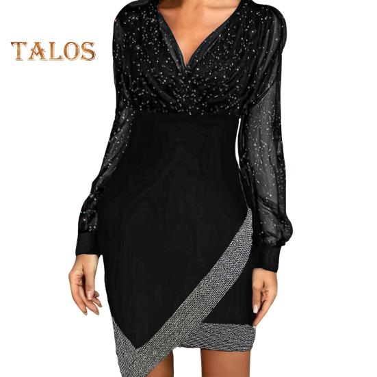 Женское платье весна-осень с V-образным вырезом, рукавами-фонариками, неровным подолом, прозрачная сетка, пайетки, пэчворк, облегающее, длиной выше колена, мини-платье для выпускного вечера M чёрный
