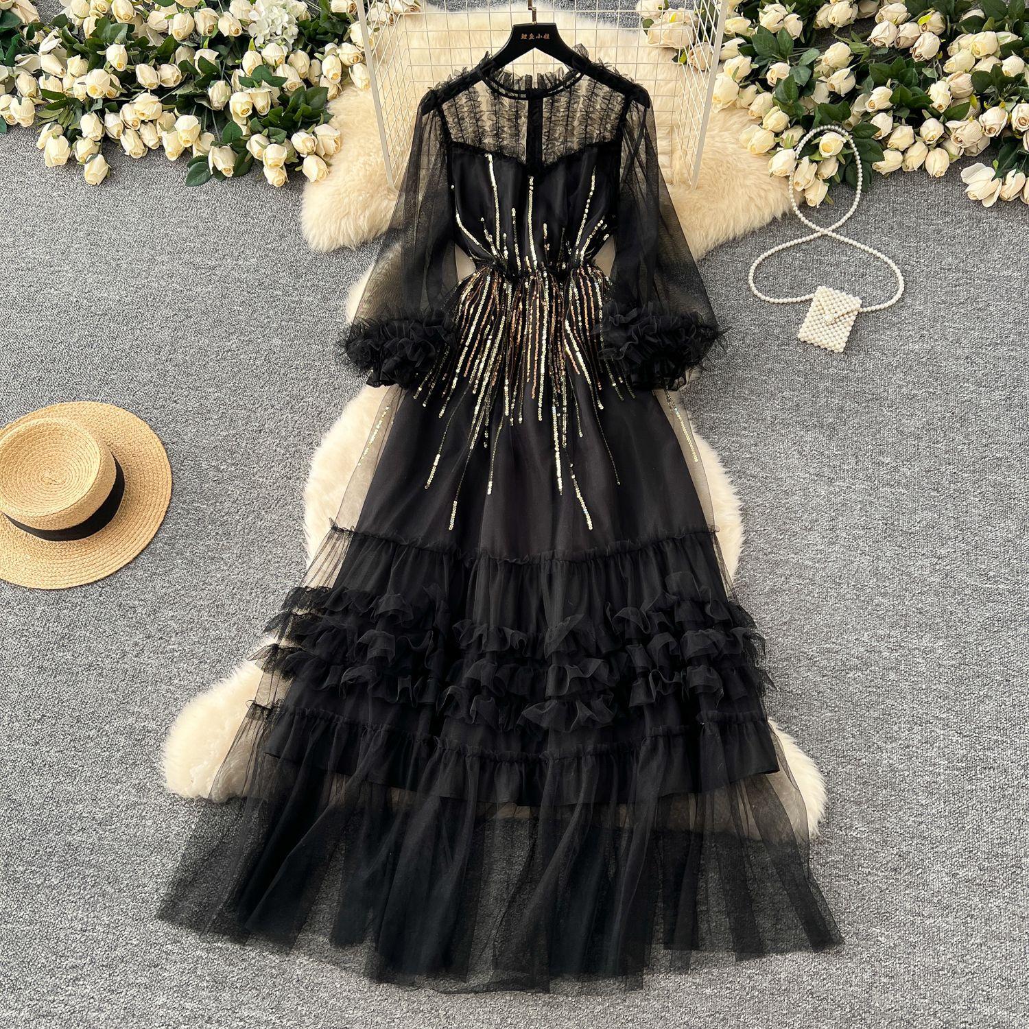 Женское платье высокого класса 2025 с пайетками, вышивкой, трехмерным кружевом, сеткой, длинными рукавами, платьем по талии и юбкой XL чёрный