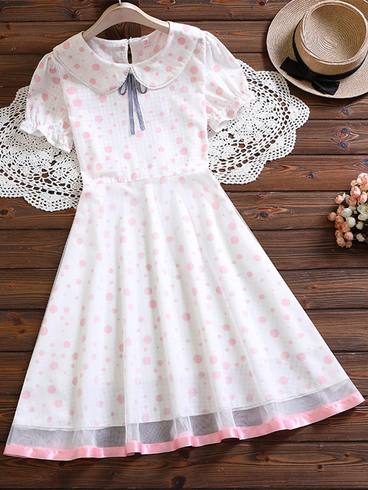Женское платье в горошек с коротким рукавом, милое платье миди-трапеция с кукольным воротником в стиле мори для колледжа, лето 2022