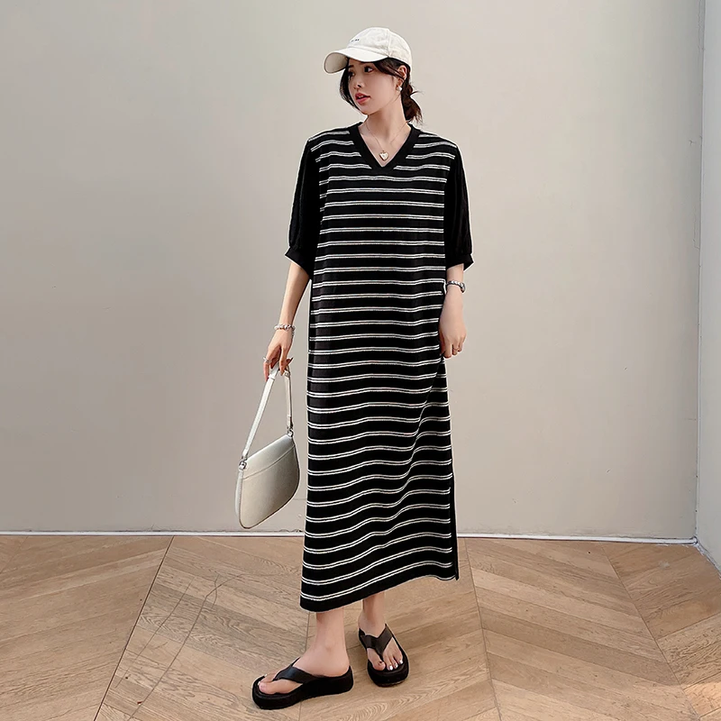 Женское платье в полоску, повседневное длинное платье с V-образным вырезом и принтом в стиле пэчворк, лето 2024
