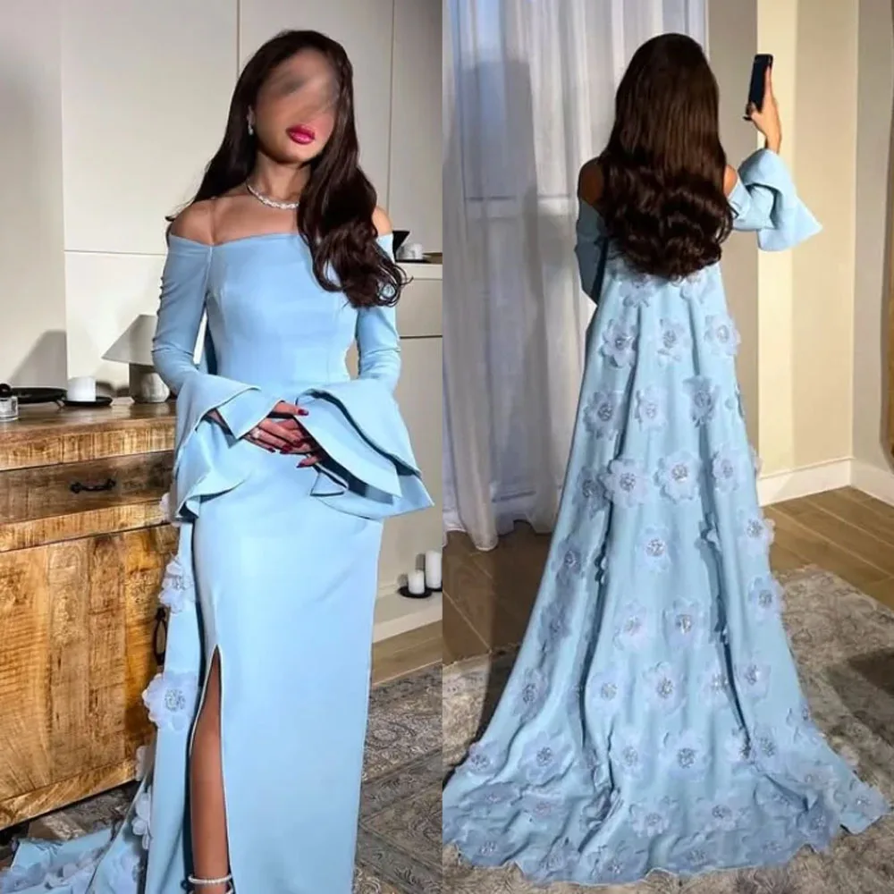 Customized High Quality Flowers Blue Dress High Fork Ankle Length Court Train Grace Robe Soirée Femme Mariage Evening Gown