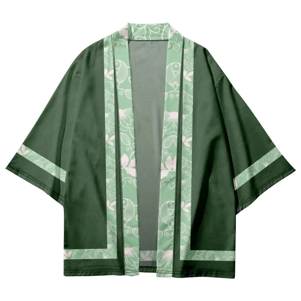 Зеленое кимоно 2021, летнее пляжное кимоно с геометрическим принтом, японское самурайское кимоно, модный мужской и женский кардиган, хаори Оби, большие топы