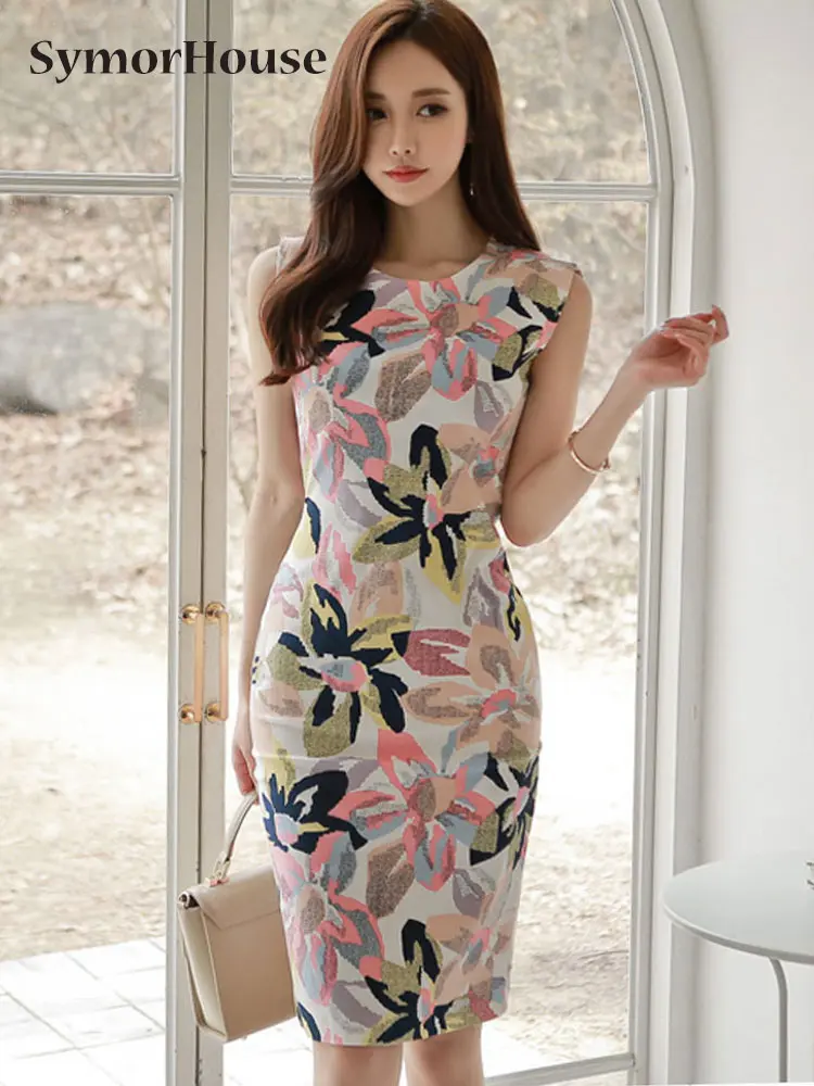 Женское платье-карандаш с цветочным принтом, без рукавов, с круглым вырезом