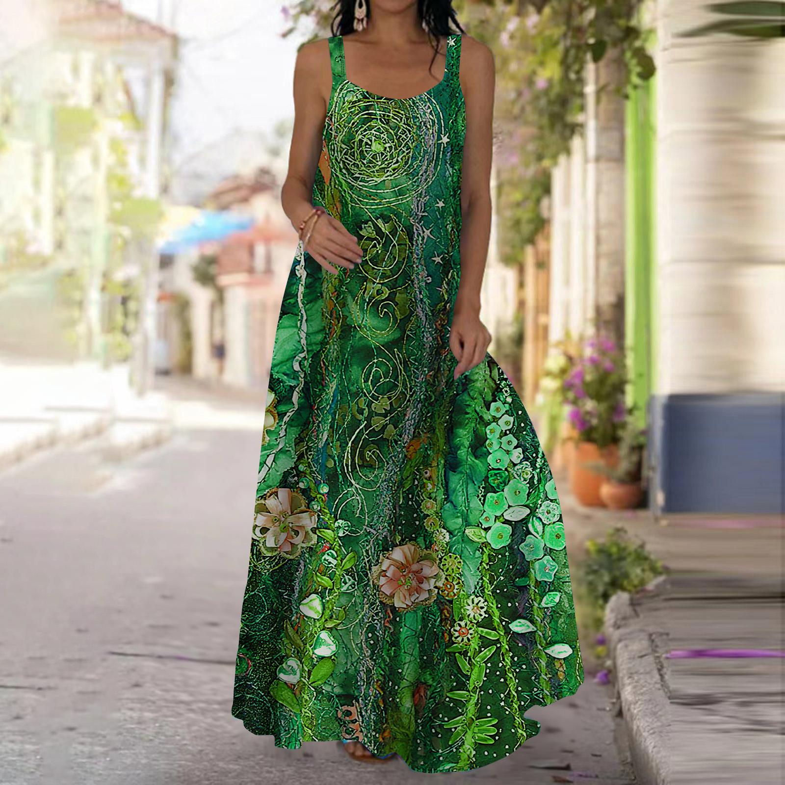 Женское платье-комбинация Длинное платье макси Зеленое платье с принтом изогнутых листьев Весна и лето Для отдыха и отпуска 8XL зелёный