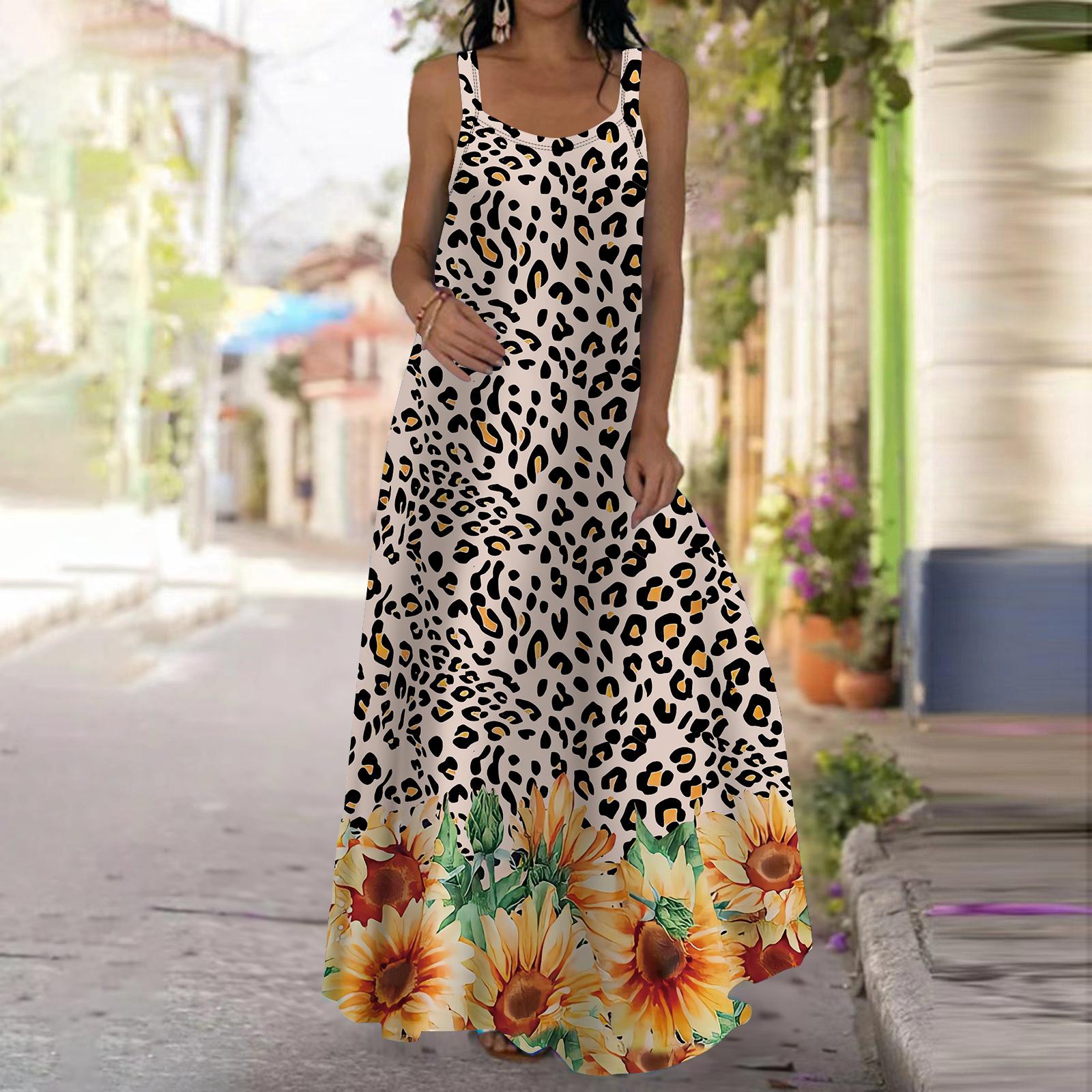 Женское платье-комбинация Длинное платье макси Черное платье с леопардовым принтом и подсолнечником Весна и лето Для отдыха и отпуска 8XL чёрный