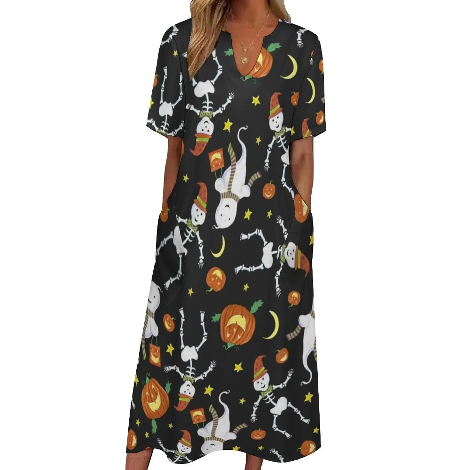 Женское платье макси в богемном стиле, длинное летнее платье с забавным принтом призраков, в стиле Хэллоуина, скелета, подарок