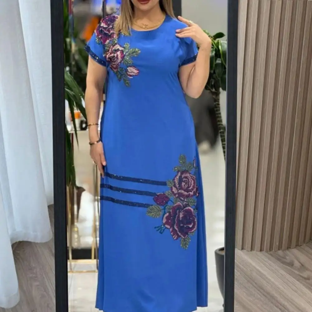 Женское платье-макси с круглым вырезом, коротким рукавом и цветочным принтом
