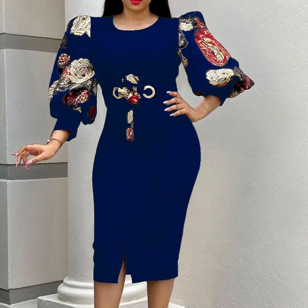 Женское платье-миди с круглым вырезом, рукавами-фонариками и запахом на бедрах