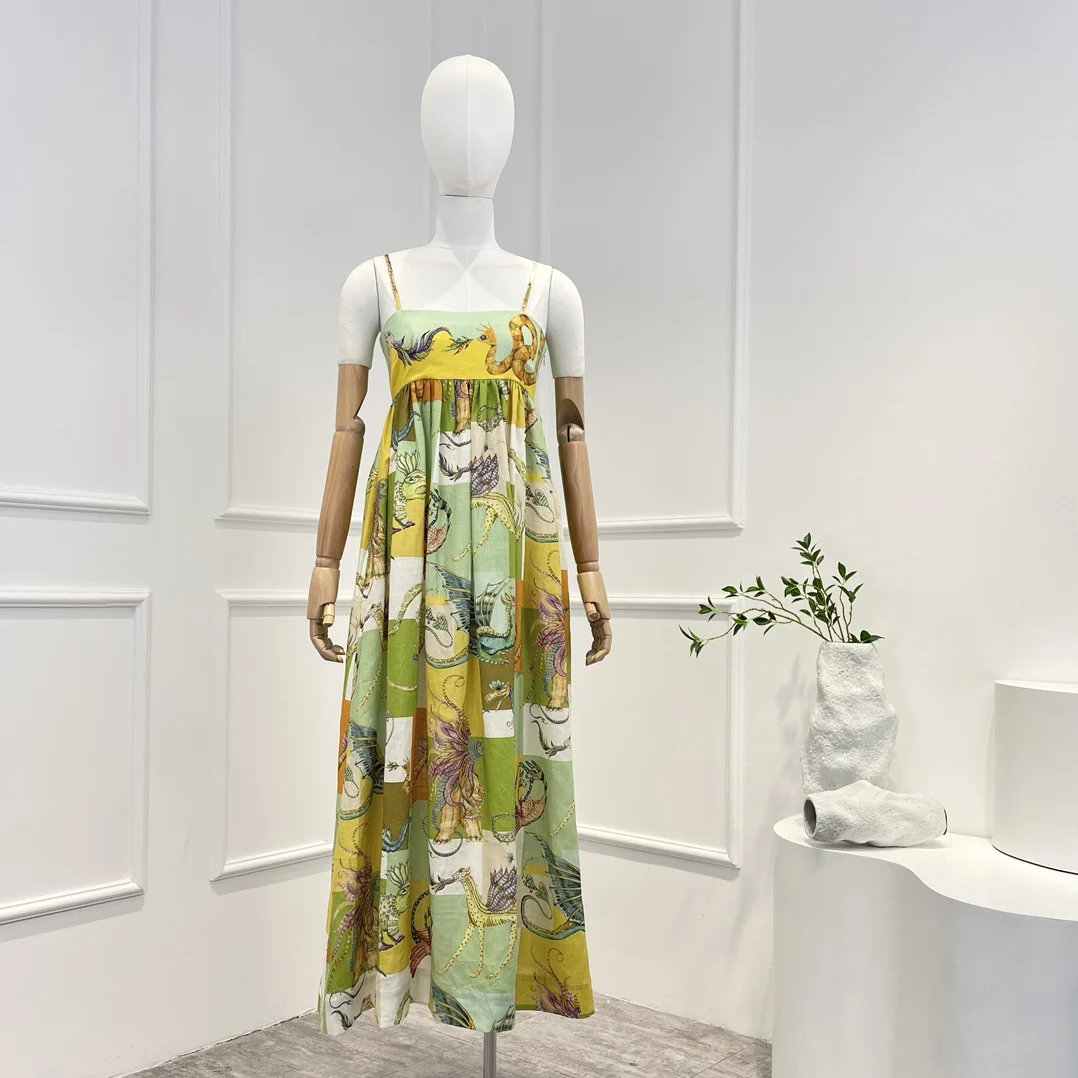 Женское платье-миди с принтом, зеленое платье с бантом сзади, без рукавов, для отдыха, лето 2023