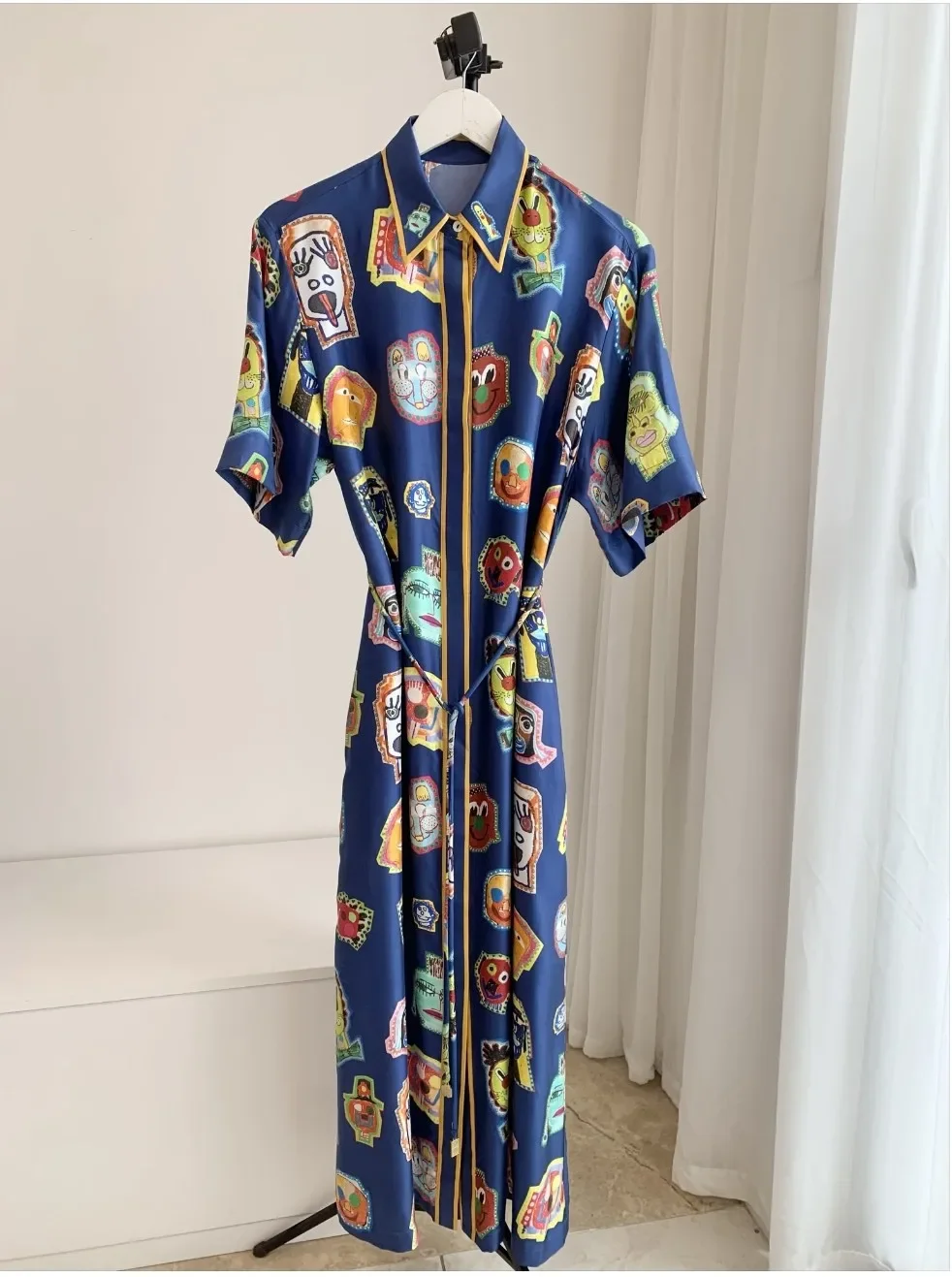 Женское платье, новинка весны 2024, шелковые винтажные платья с принтом, поясом, отложным воротником и коротким рукавом