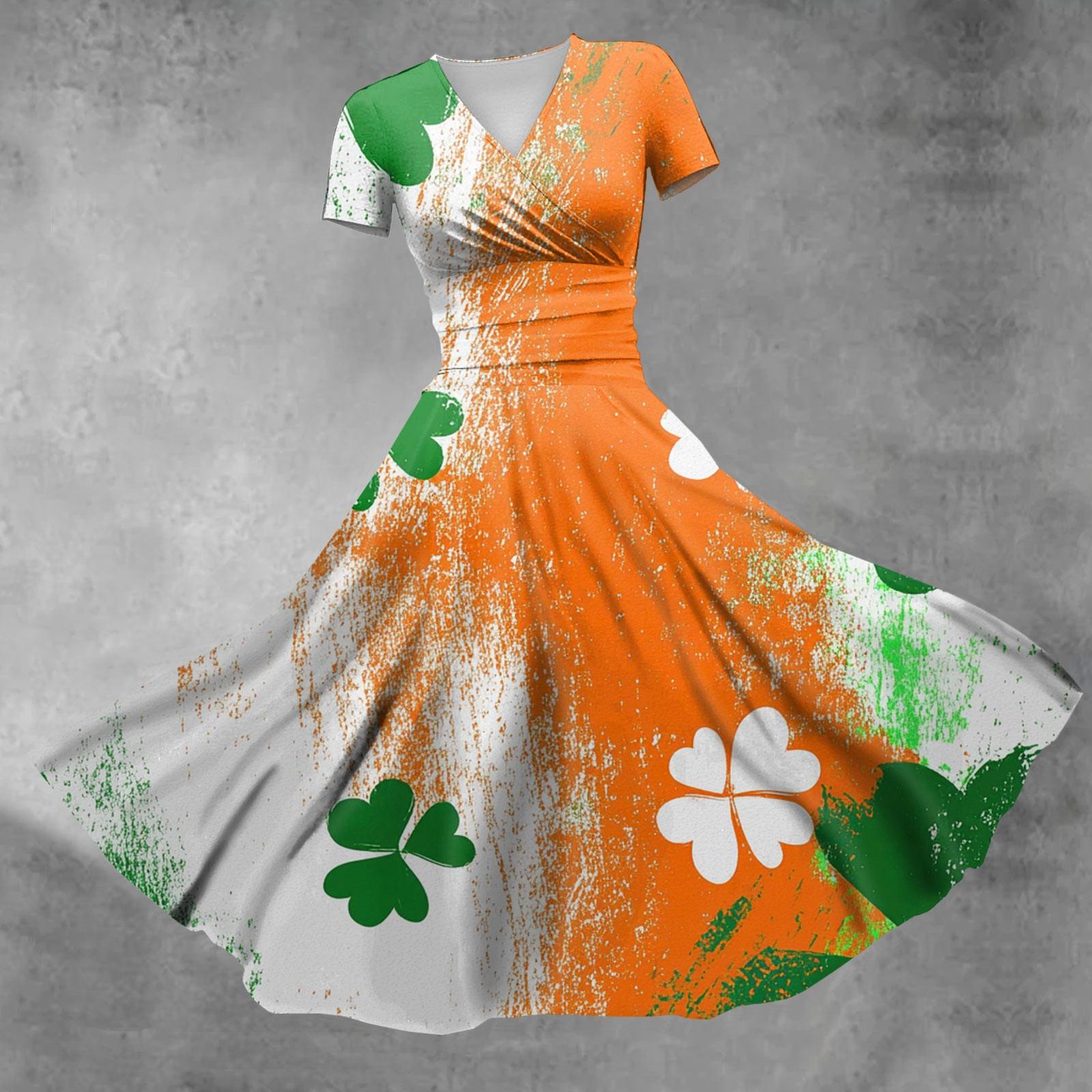 Женское платье принцессы, сексуальное платье с V-образным вырезом, принтом, присборенной талией, плиссировкой и короткими рукавами XL шафрановый