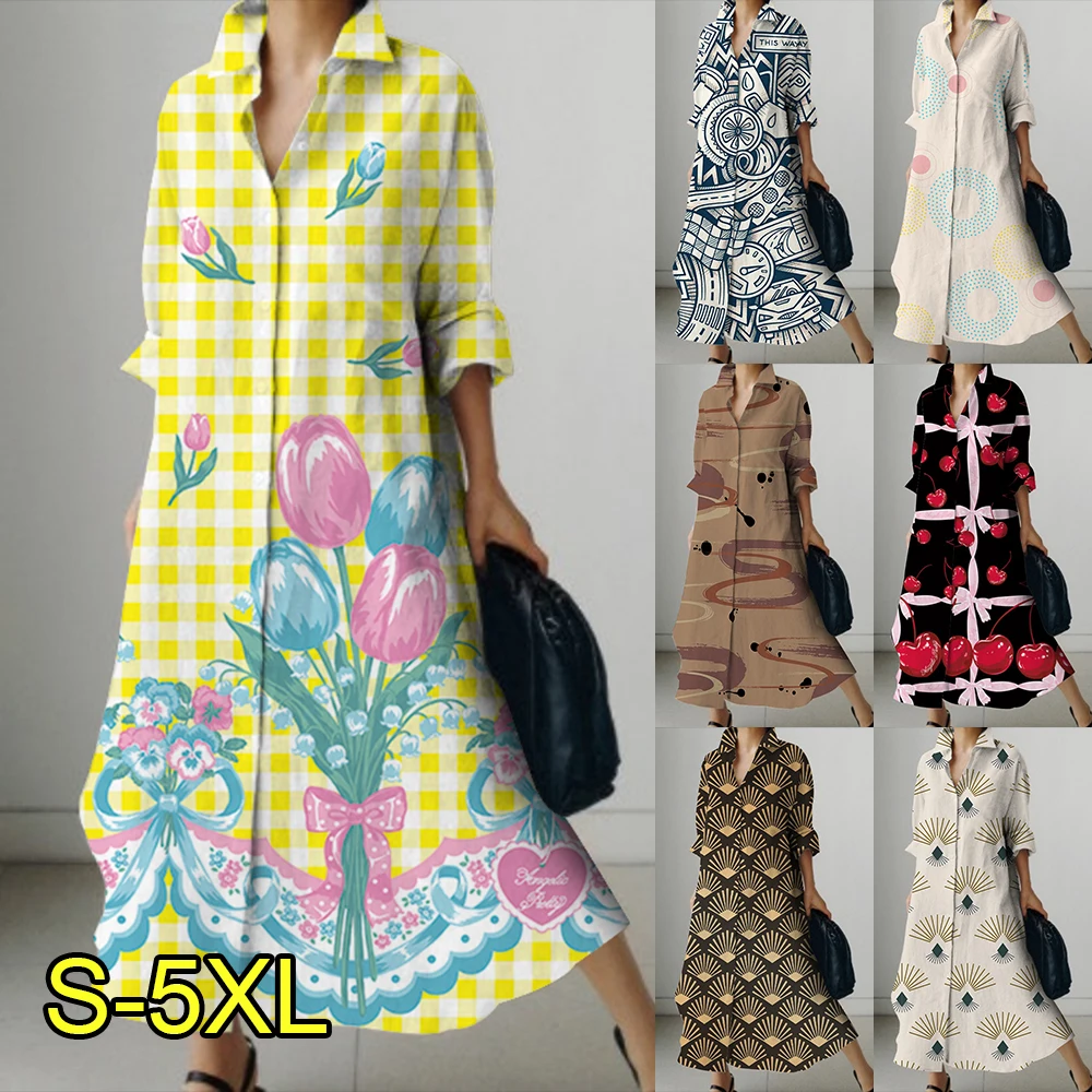 Женское платье-рубашка, элегантное платье с милым принтом, длинное пляжное платье, длинное платье для осени