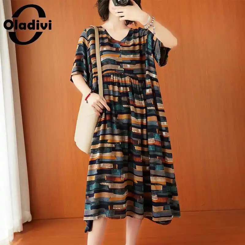 Женское платье-рубашка Oladivi, летнее свободное платье-миди в полоску с коротким рукавом, большого размера, 2021