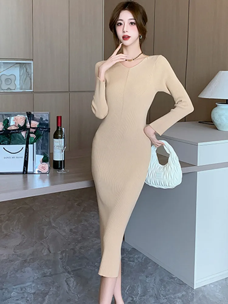 Женское платье-свитер SMTHMA, корейское облегающее длинное трикотажное платье с v-образным вырезом и длинным рукавом, зима 2019