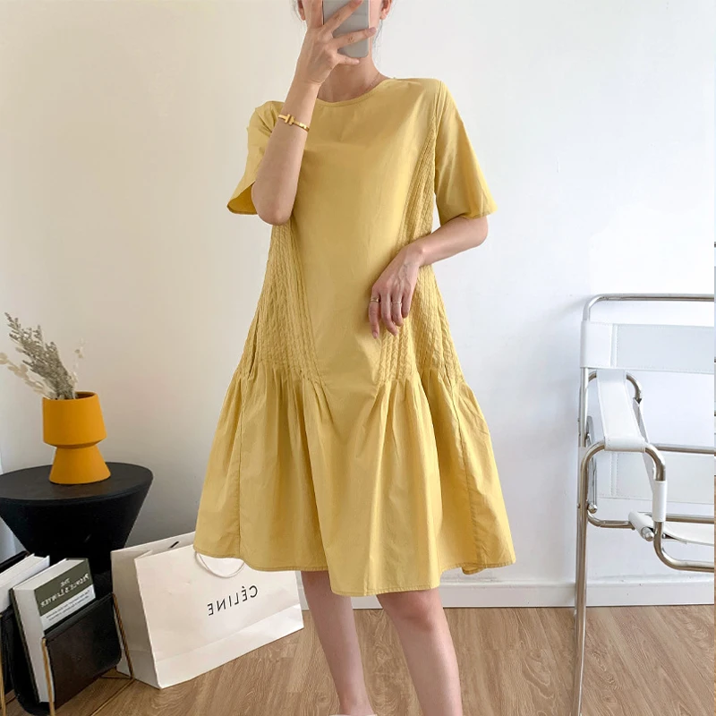 Женское платье со складками Johnature, однотонное с круглым вырезом и карманами, до колена, простого дизайна, повседневная одежда на лето 2023
