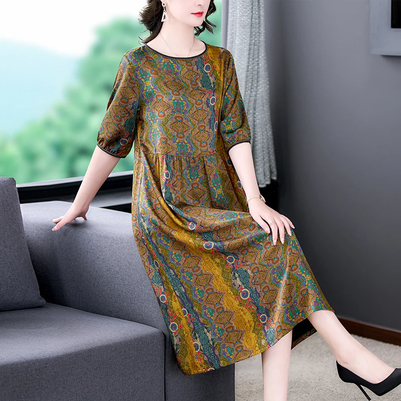 Женское платье средней длины из натурального шелка, с коротким рукавом