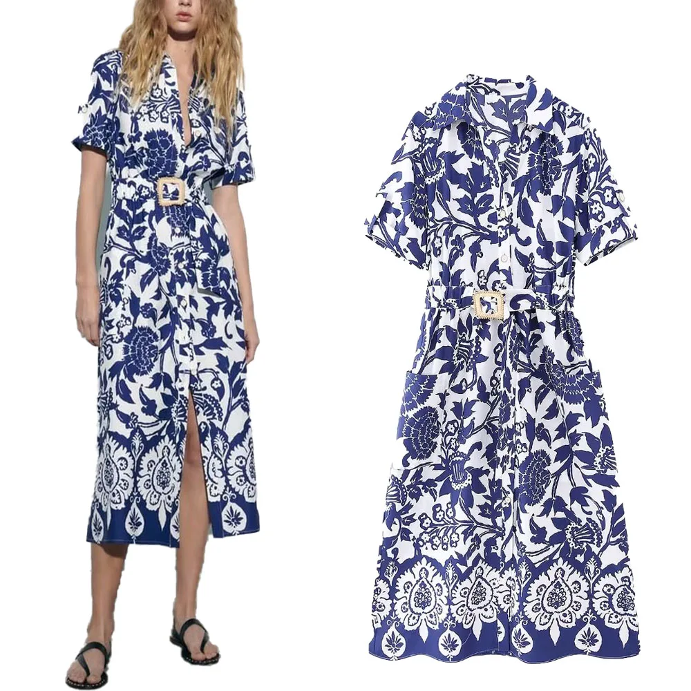 Женское платье средней длины, удобное платье с отложным воротником и коротким рукавом, с принтом