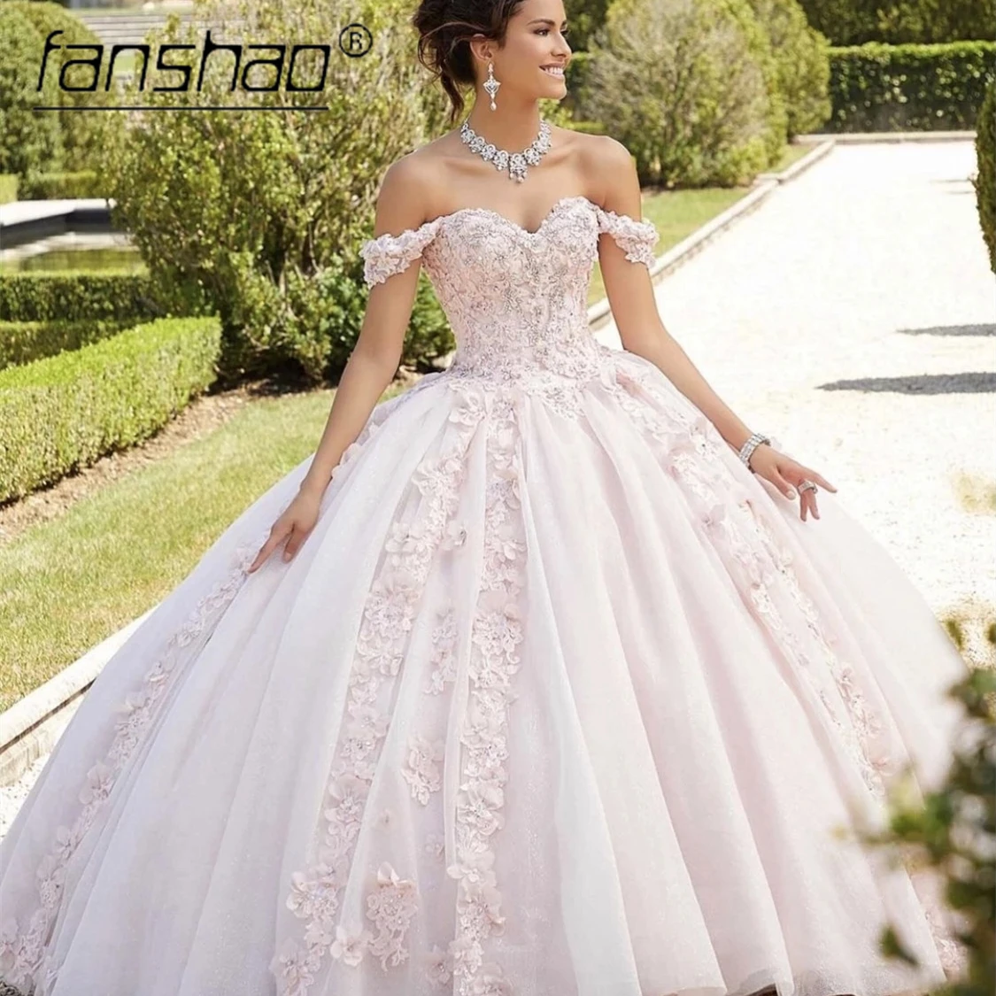 Женское платье с блестками Fanshao, бальное платье с 3D цветочной аппликацией и открытыми плечами для девушек 15 лет, торжественное платье с буси...