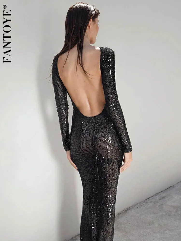 Женское платье с блестками Fantoye, черное однотонное элегантное платье с длинным рукавом и открытой спиной, весенние тонкие вечерние платья