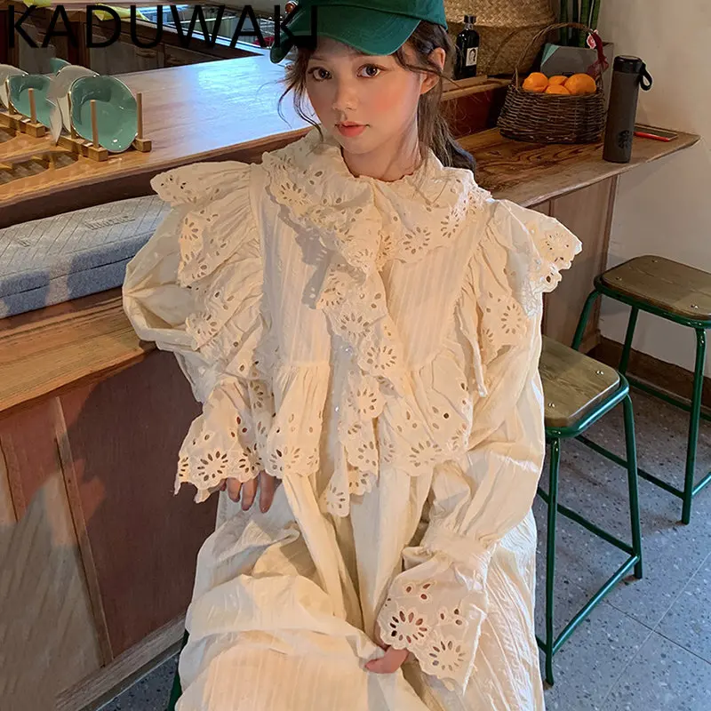 Женское платье с вышивкой и рюшами, винтажное платье большого размера с длинным расширяющимся книзу рукавом, корейский стиль, лето 2023